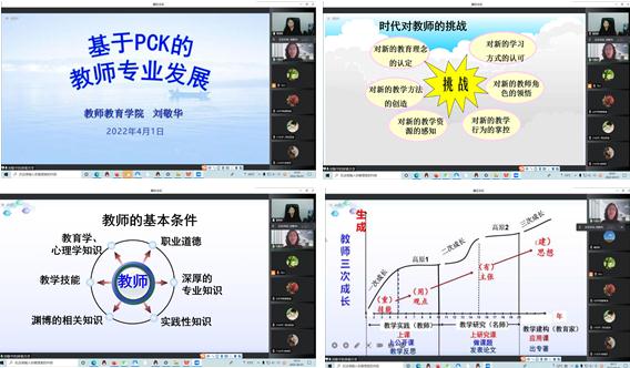 刘敬华教授以“基于PCK的教师专业发展”为主题,提出“你怎么认识教师这一职业?”“一个合格的中学教师应该具备哪些条件?”“时代对教师的挑战”“一堂好课的标准是什么?”等发人深省的问题,结合自己三十多年的化学学科教学研究与经验对以上问题一一进行分析与解答,就基于PCK教师专业发展过程中教师的三次成长历程,刘教授以专业的视角进行讲解,并对即将成为教师的师范生提出要求、给予鼓励并寄予厚望。也为我院青年教师的快速成长提供了清晰的思路。
