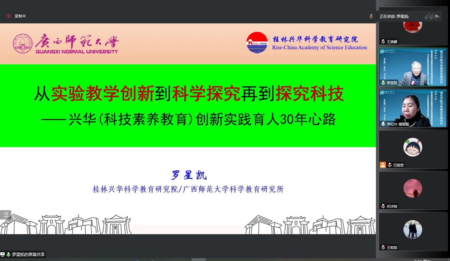 介绍了科学教育专业在课程育人、活动育人、平台建设、机制建设过程中的创新实践,打造了中国式STEM教育,培养了学生的科技核心素养。罗教授展示了第六届广西青少年科技运动会的部分科技创新实验,映射了科技素养、科技探究在科学教育过程的体现,使科学教育实践以一种全新的模式打开,极大扩展了师生科学教育的视野。