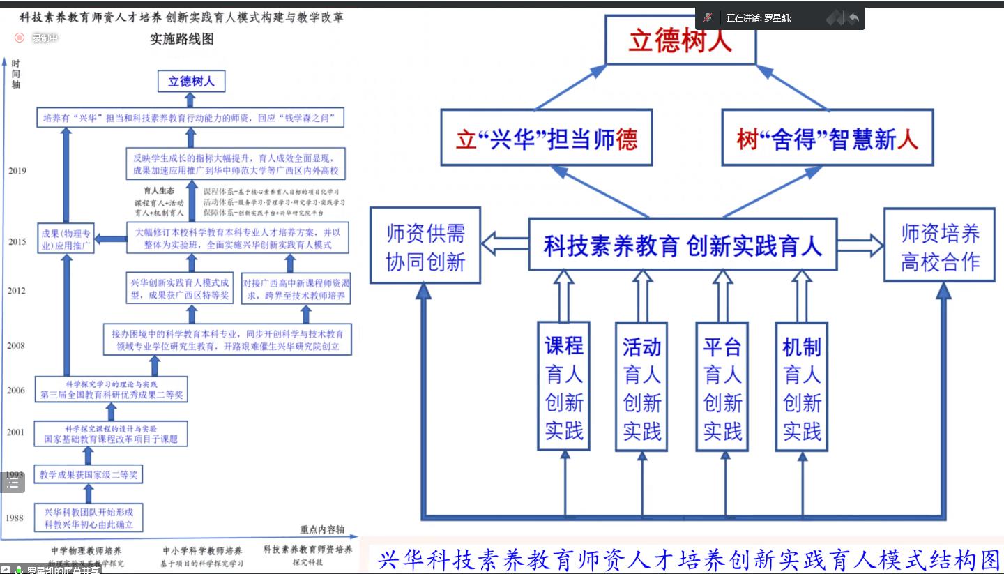罗教授首先从国家政策层面分析了科学教育教师培养的必要性与急迫性;分享了兴华创新实践育人模式从1988年到2022年历经30多年,在科技素养教育师资人才培养、创新实践育人模式构建与教学改革实施过程中的发展经验。