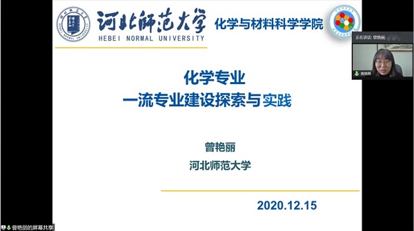 2020年12月15日,化学与化工学院特邀河北师范大学化学与材料科学学院院长曾艳丽教授进行了主题为“化学一流专业建设探索与实践”的线上指导讲座,化工学院全体教师在主楼10楼录播室参加了培训指导,为正在进行的一流课程建设与师范专业认证工作的深入推进实施指导。