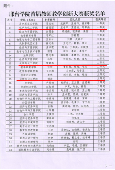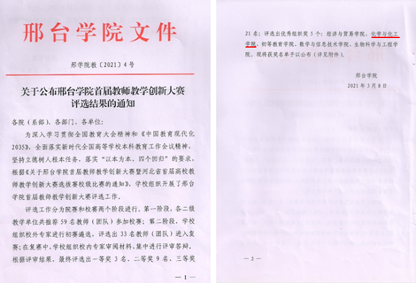为深入贯彻全国教育大会精神和《中国教育现代化2035》,全面落实新时代全国高等学校本科教育工作会议精神,坚持立德树人根本任务,落实“以人为本、四个回归”的要求,我校于2020年11月初启动了邢台学院首届教师教学创新大赛。经过长达三个月的激烈角逐,我院共有3位教师(团队)进入复赛并分别获得一、二、三等奖。其中,由董丽丽副教授带领的现代分析技术团队(王春平、夏爱清、邢翠娟)获得一等奖,并代表我校参加省赛。常姗燕博士获得二等奖,胡洁副教授获得三等奖。我院领导高度重视此次教师教学创新大赛,认真组织,全方位地为各参赛教师提供服务和支持,最终斩获优秀组织奖。
