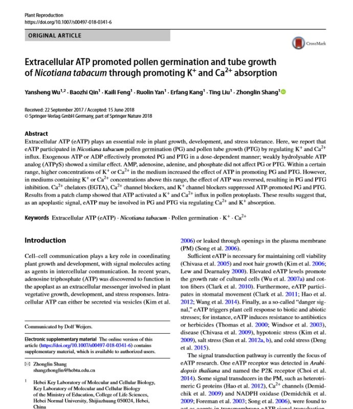我院教师武延生副教授在攻博期间,在其导师尚忠林教授的启发下,越发对Roux 教授的观点产生怀疑,认为eATP在花粉中仅仅发挥抑制性作用是没有生物学意义的,可能会发生促进性作用。撼动学术权威的观点不但需要勇气,更需要无懈可击的、确凿的证据,这就需要严密的实验设计与大量的尝试。武老师经过长期不懈的潜心研究,终于发现了ATP发挥促进性的培养条件,而这个培养条件更接近于花粉的生理条件,也就是说,ATP促进花粉萌发和花粉管生长才符合自然界的真实情况。最近,武老师把他的初步研究成果《Extracellular ATP promoted pollen germination and tube growth of Nicotiana tabacum through promoting K+ and Ca2+ absorption》以第一作者在线发表在Plant Reproduction杂志上( https://doi.org/10.1007/s00497-018-0341-6)。植物有性生殖问题是植物学界的热点也是难点,这个研究成果可开启一个全新的植物有性生殖研究新方向,可望在农业和果品生产等领域产生重要的作用。