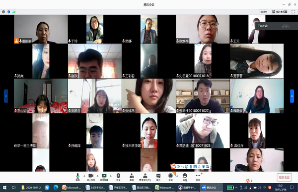2021年3月16日下午,化学与化工学院2021年化学专业顶岗实习动员会在腾讯会议上举行。化学与化工学院党总支副书记樊娜、副院长董丽丽、实习带队老师张冬亭、教学科研办公室主任王彩君、学生管理办公室主任于玲及2018级化学、2020级化学接本的70名学生参加了会议。