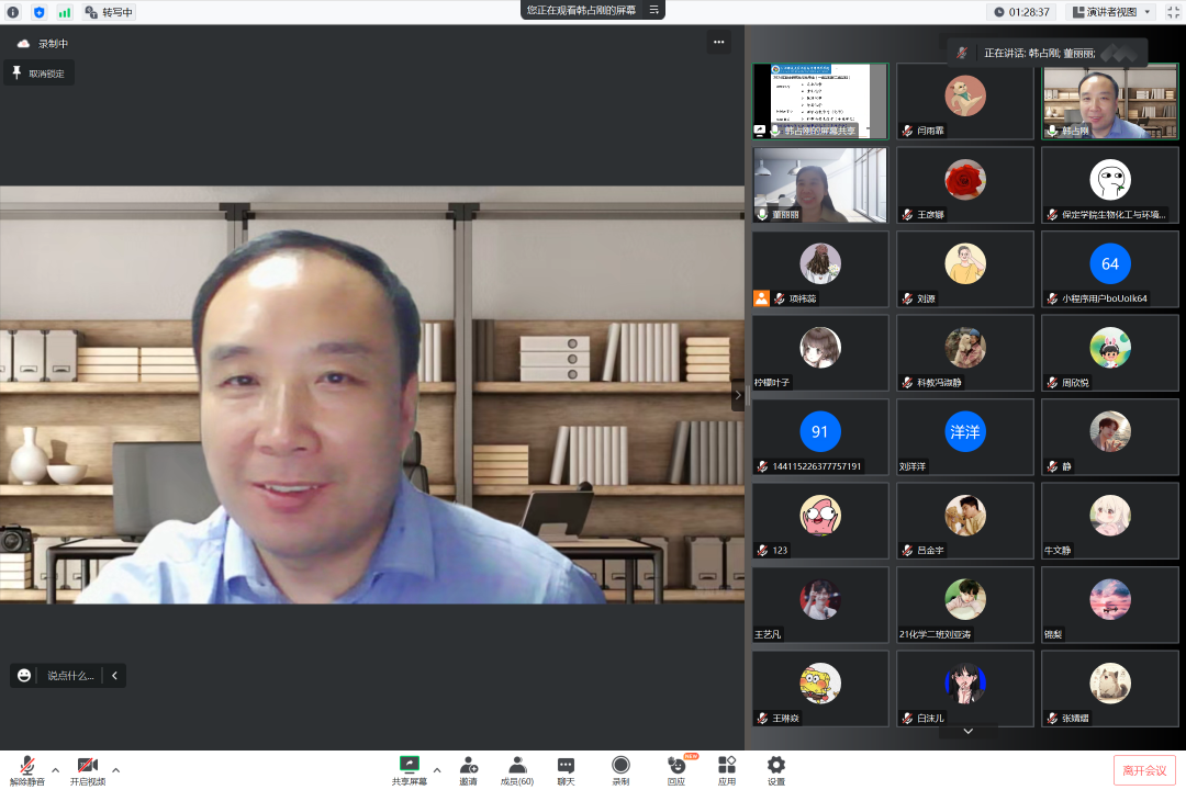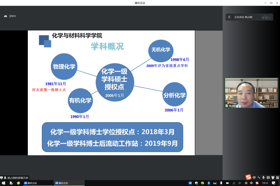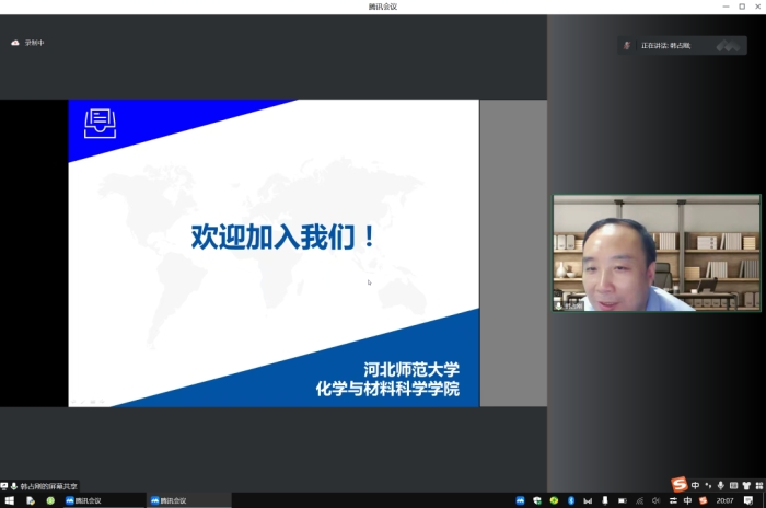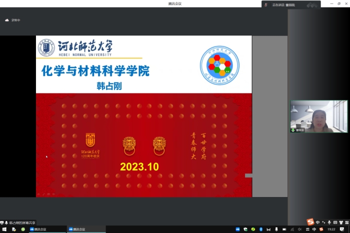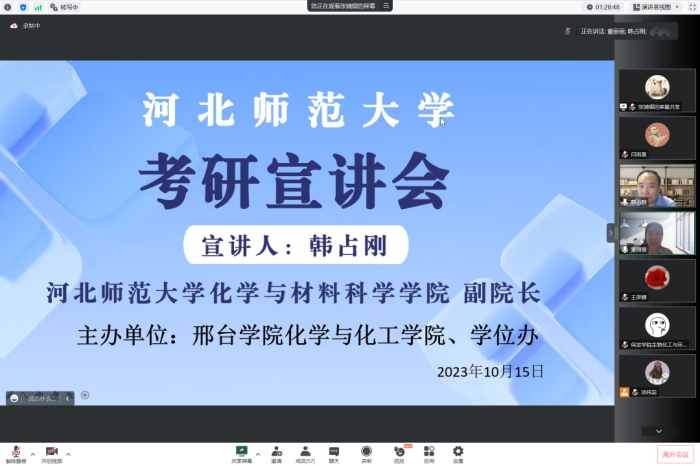 宣讲会特邀河北师范大学化学与材料科学学院副院长韩占刚教授,由化学与化工学院院长董丽丽教授主持,我校化学与化工学院及邯郸学院和衡水学院200余名师生参加了本次宣讲会,会议以线上会议形式进行。