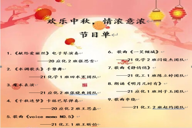 时光的车轮碾过一道深深的痕迹,皎洁的月光传达一种深深的思念,在中秋佳节,师生欢聚一堂,在参与活动的同时提升文化艺术欣赏品味,引导自觉追求真善美的事物。雄关漫道真如铁,化学与化工学院似锦的前程正等待着莘莘学子去开创,相信化学与化工学院也将在佳节美好的祝愿下变得更加温馨。