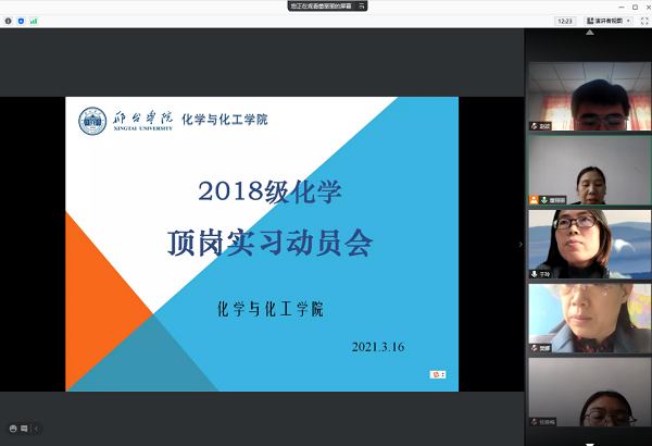 2021年3月16日下午,化学与化工学院2021年化学专业顶岗实习动员会在腾讯会议上举行。化学与化工学院党总支副书记樊娜、副院长董丽丽、实习带队老师张冬亭、教学科研办公室主任王彩君、学生管理办公室主任于玲及2018级化学、2020级化学接本的70名学生参加了会议。