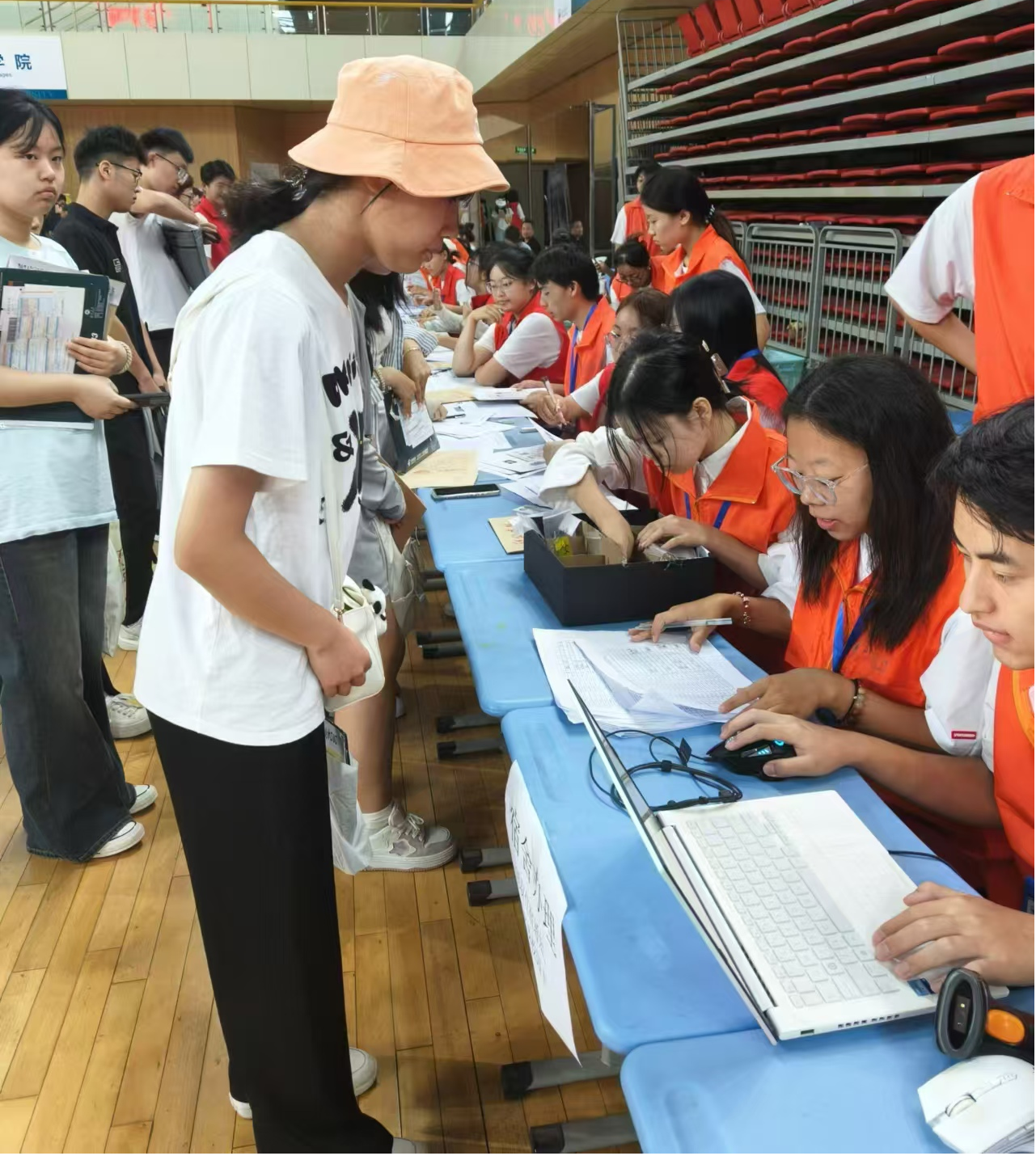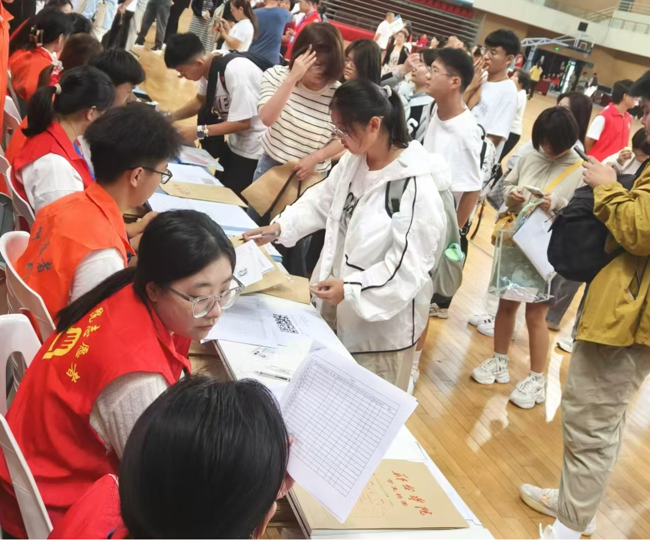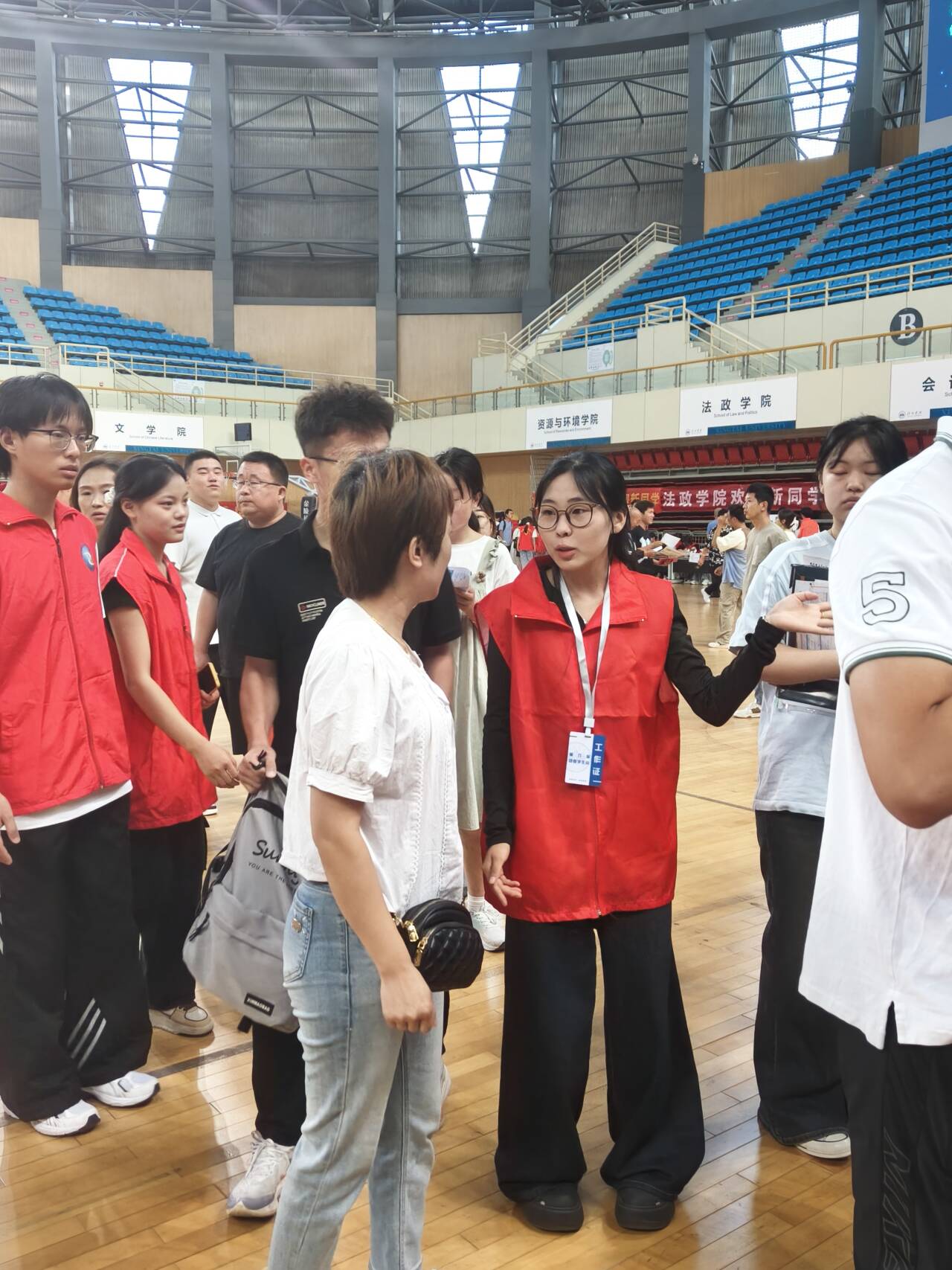 体育馆报道现场,各项流程有条不紊地进行着。志愿者分工明确,按照新生报到、核验新生材料、发放宿舍信息的顺序,一步步引导新生快速、顺利地完成报到手续。面对新生们提出的各种问题与疑惑,志愿者们“一对一”的爱心服务为新生搭建了一条有温度的迎新通道。他们穿梭在学院报道点、教学楼、宿舍楼、校园餐厅,随处可见他们忙碌的身影,让每一位报到的新生倍感温暖和亲切。