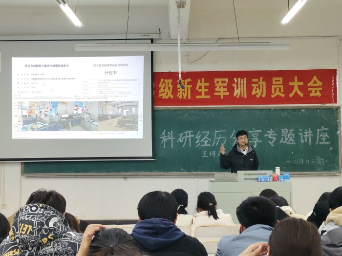 会议伊始,李伟涛为同学们做个人基本情况和教科研情况介绍,其中包括个人简介、研究方向概述、寄语等,并结合个人科研经历提醒同学们开展科学研究要注重课题的原创性、时效性等问题。随后对其研究背景、内容及前景进行详细介绍,阐述了基于多级孔金属—共价有机框架复合材料的金属分离转化构效关系相关研究。基于此课题,李伟涛博士详细介绍了金属检测与分离的重要性、研究现状以及多孔晶体材料在金属分离中的应用前景,除此之外,还介绍了课题开展的相关科研条件,包括一些大型光谱检测仪器和材料制备等科研仪器及技术,会议结束之际,李伟涛对同学们提出更高的要求和更殷切的期待,希望同学们积极加入学院各个科研团队中去,做人如水,做事如山,脚踏实地,做一名实事求是的科研人,厚积薄发,勤于思考,做一名有想法的科研人,跟上时代的步伐,提升自身的综合素质,一路向前,共创辉煌未来。