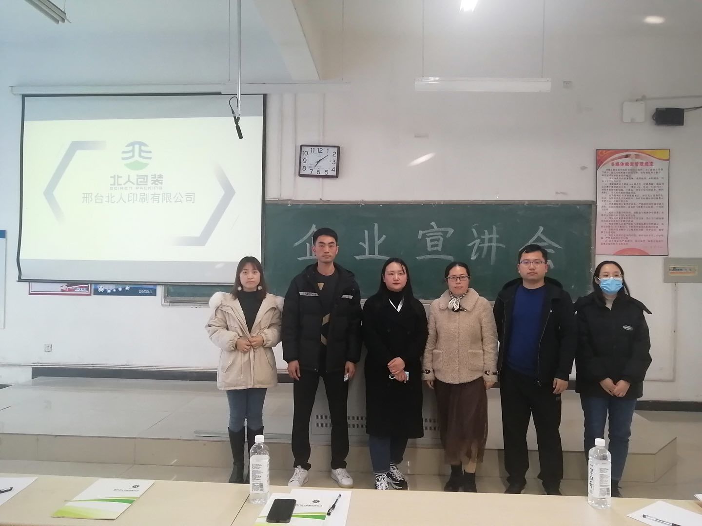会议伊始,于玲老师分析了近几年来我院毕业生的就业趋势,并向同学们简单介绍了邢台北人印刷有限公司。接下来企业负责人从公司概况、公司背景、公司特点等方面讲解了公司整体运营情况,并详述了其机械、设备实力与年盈利情况。同时将公司的主要产品及丰富的企业文化呈现给学生,使同学们更加全面的了解公司。最后企业负责人与学生进行现场问答互动,并发出简历投递邀请。