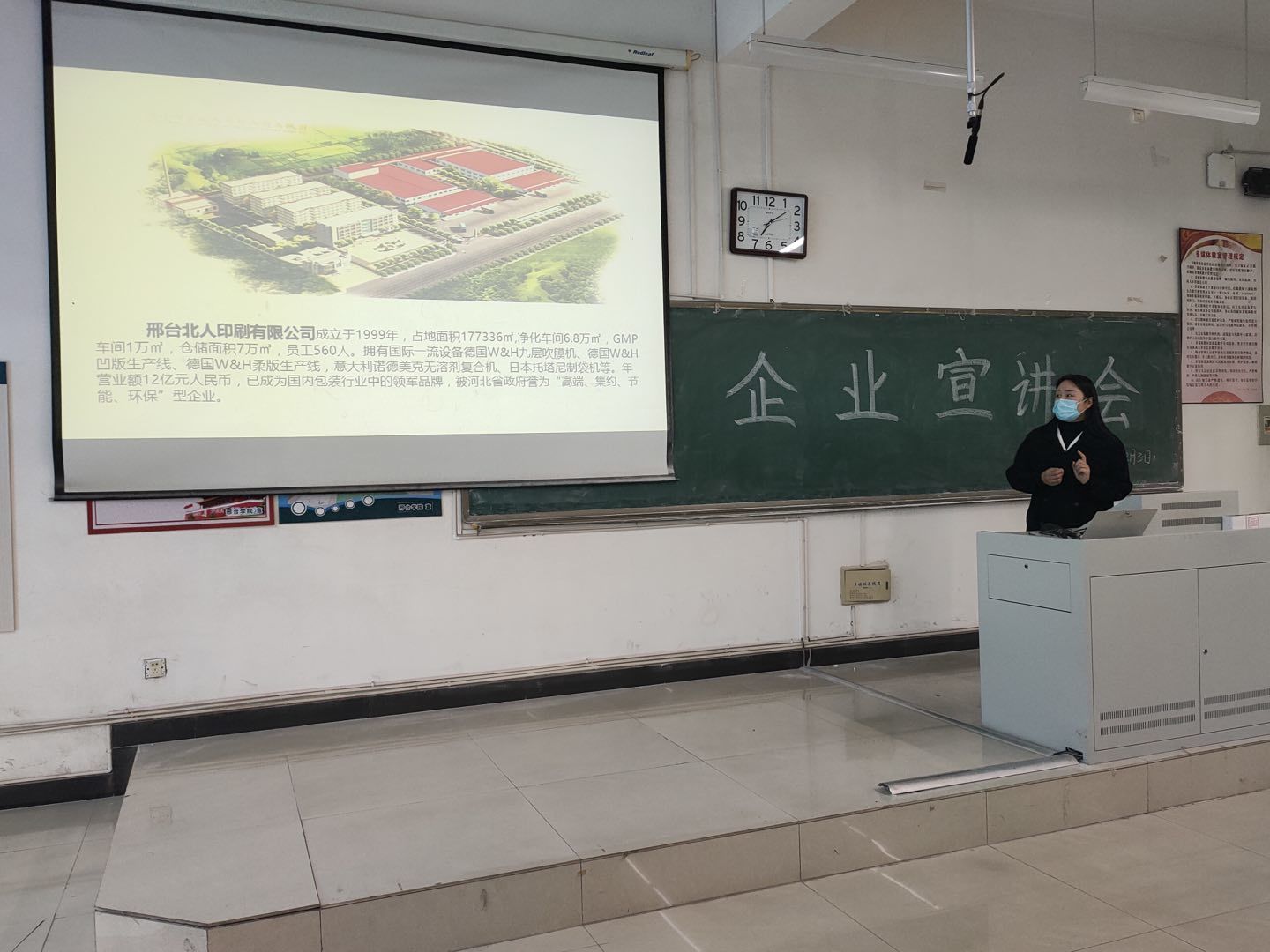 为了提升学生的行业认知,丰富求职经验,拓宽就业渠道,化学与化工学院于2021年12月3日邀请邢台北人印刷有限公司在公教楼401举办了企业宣讲会。出席本次宣讲会的有学管办主任于玲老师、辅导员马龙老师、李璇老师、霍国钠老师、刘思老师。