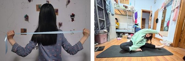 在做好疫情防控的同时强身健体,同学们利用业余时间在宿舍内做着自己喜爱的运动。20化学本二司瑞岩利用自己的课余时间举铁锻炼自己的肌肉,专业的健身器材展示着自己对运动的热爱,用自己的方式享受生活,释放压力。为日后的线下学习做好了充足的准备。21化工本一邵宇畅、杜前衡、郝嘉信利用身边的健身器材,在课余之时进行体能锻炼,疫情防控之下,他们仍然不忘加强自身,增强体质,以最佳的精神状态面对网课的学习。21化工本二的孟宪军利用床铺进行平板支撑,以此提高身体代谢,激活脊柱的核心肌群,提高脊柱的稳定性,锻炼腹部力量。21化学一班刘怡瑶、侯涵冰利用垫子进行瑜伽活动,运动量不大的活动却能使人得到充分的锻炼,既可以缓解学习后的疲惫,改善睡眠,也不会打扰到同宿舍的其他同学,合理分配学习与休息的时间让抗疫期间的生活充实而又美好!