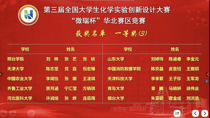 在第三届全国大学生化学实验创新设计大赛 “微瑞杯”(华北赛区)中,我院常姗燕、杨玉敏老师指导的团队(参赛队员刘帅,张艺,张桢)获一等奖并入围全国决赛;赵治巨、王莉莉老师指导的团队(参赛队员巩士霖,董鑫洁,刘英琪)获三等奖。