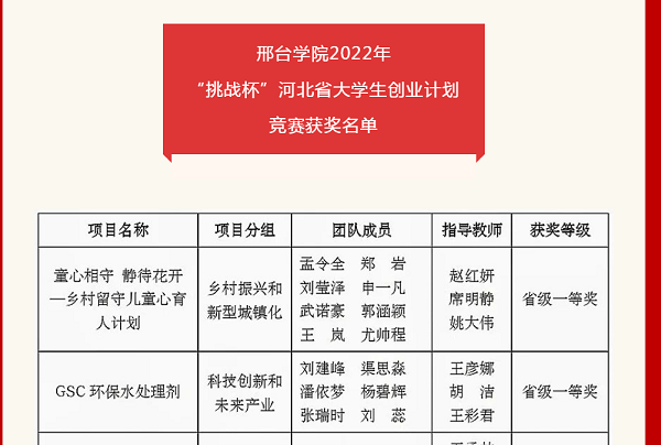 在2022年“挑战杯”河北省大学生创业计划竞赛中,我院刘建峰,渠思淼,潘依梦,杨碧辉,张瑞时,刘蕊等同学组成的团队获省级一等奖(指导教师王彦娜、胡洁、王彩君);王雨霏,邸姿颖,郑金月,刘雪玲组成的团队(指导教师邢翠娟,夏爱清,于玲);薛晋卉,梁红旗,陈乐言,李鑫娇组成的团队(指导教师郭桂全,于玲,胡巧红)获省级二等奖。