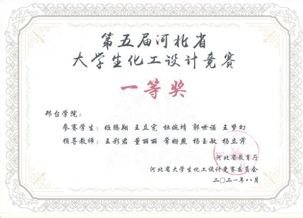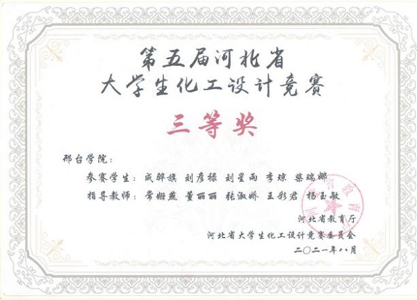 | 5 | 邢佳艺、郝鑫灵、李明明、王思涵、李龙泽(2018级化学工程与工艺) | 第五届河北省化工设计竞赛 | 省级二等奖 |