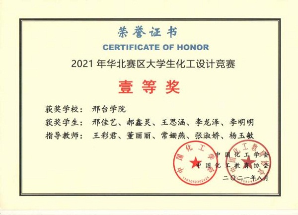 | 3 | 邢佳艺、郝鑫灵、李明明、王思涵、李龙泽(2018级化学工程与工艺) | 2021年华北赛区大学生化工设计竞赛 | 华北赛区一等奖 |