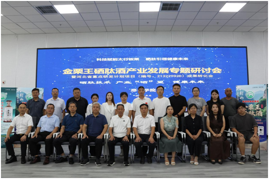 本次会议聚焦河北省重点研发计划项目(编号:21322902D)重大成果转化产品“金栗王硒肽酒”,政产学研各界代表共商硒肽酒产业化发展路径。中国发展战略学研究会经济委员会规划部主任、河北养生行业协会副会长朱振岭,京津冀绿色产业创新战略联盟副主席李春,河北省养生行业协会副秘书长赵灏,前南峪党委书记郭天林,邢台市信都区林业局副局长靳智昌等受邀参加了会议并讲话,邢台学院校长助理、化学工程与生物技术学院院长赵宝华教授,邢台学院科研处处长董丽丽教授,邢台学院营养与食品安全研究中心主任朱秀敏教授,邢台学院化学工程与生物技术学院博士代表宋菲、李代等参加研讨。