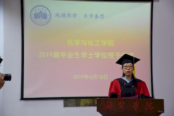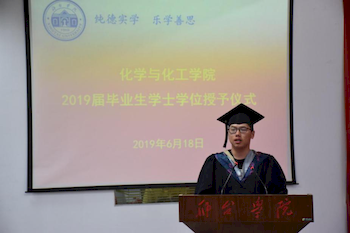 2015级化学专业杨旭同学作为毕业生代表发言。带着四年满满的收获,带着邢台学院人的气节和风骨、带着化工学院人的责任与担当,我们信念坚定地踏上新的征程。牢记胸中的梦想和心中的底线,将国家的命运和个人的前途紧密的联系在一起,牢记我们的责任和使命,在平凡的岗位活出不平凡的人生。