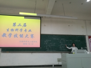 “第二届生物科学专业教学技能大赛”于2018年12月13日在公教楼成功举办。本届大赛由生物科学与工程学院主办,面向生物科学专业在校生。大赛包括讲授课程、自制教具和钢笔字共三项比赛,旨在促进生物科学专业学生教师职业技能的训练,提升学生的生物从教能力,增强实践应用能力,从而为成为合格生物学教师打下坚实的基础。