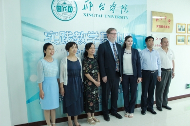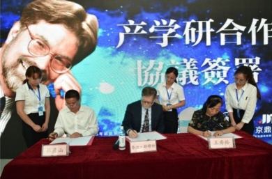 6月18日在古郡巨鹿台湾穆拉德生物科技园,化学与化工学院院长王秀玲教授,与2006年诺贝尔物理奖得主乔治•斯穆特博士,以及河北京鼎检验检测服务有限公司总经理杜彦山,分别代表邢台学院、河北斯穆特科技发展有限公司、京鼎检验检测服务有限公司签订产学研三方合作协议。