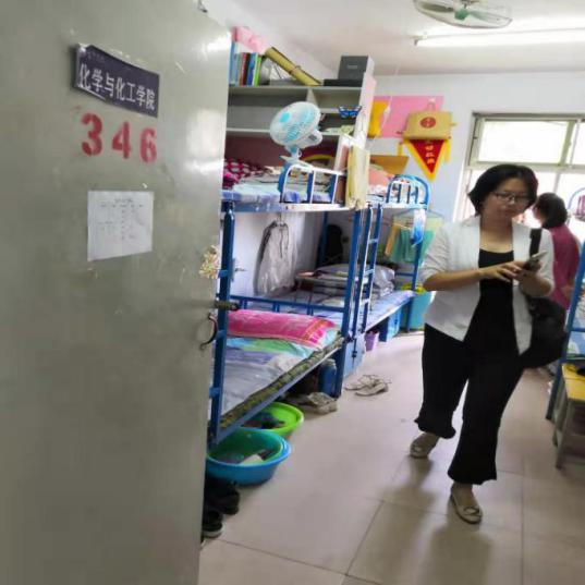2019年9月1号下午,化学与化工学院书记樊娜、学管主任于玲以及各位辅导员一同来到本院的学生宿舍看望每位学生的住宿生活情况。同学们正在收拾整理宿舍,迎接新学期的开学第一课。每一位同学都以积极、热情的态度来迎接新的一个学期,宿舍内务以及卫生都很整洁,其中较好的几个宿舍如下:金桥五号的425、346、138、130以及南区四号宿舍的学生,宿舍收拾的干净整齐,同时使宿舍赋予生活气息,给人以家的温暖。这是我们学习的榜样。