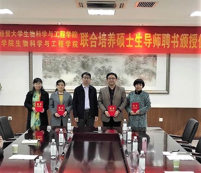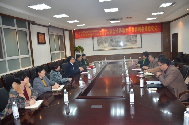 2018年11月14日,河北经贸大学生物科学与工程学院与邢台学院生物科学与工程学院联合培养硕士生导师聘书颁授仪式隆重举行。河北经贸大学生工院院长赵士豪、实验中心主任张金良,邢台学院党委书记李相佑、副院长蔡振禹、学位办主任张兰英、生工院院长武宇红和部分教师代表参与了此次活动。